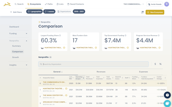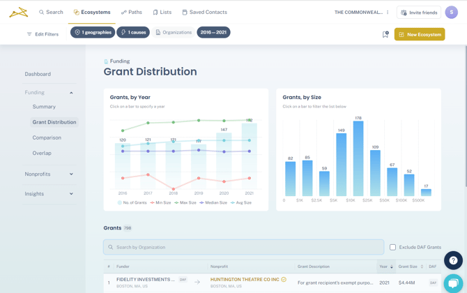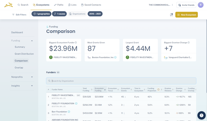 Here, you can see all the institutional funders supporting your ecosystem, with specific data points and insights into their giving to help compare them.