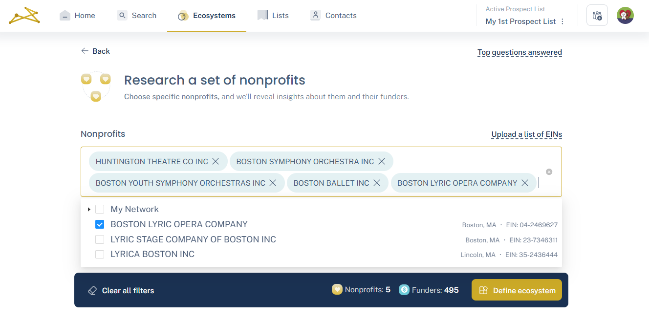 Click inside the Nonprofits box to add the funding organizations you'd like included in your Ecosystem. Type into the box to look up the nonprofits by name or EIN.